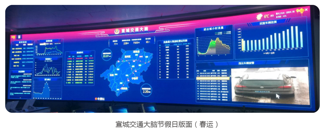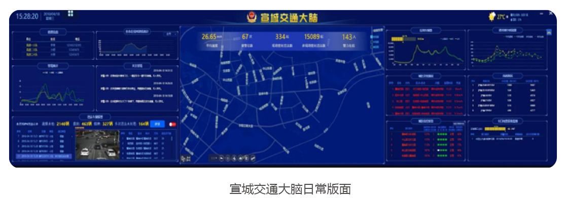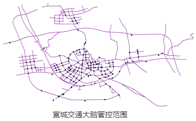 目前,纳入宣城交通大脑监管范围的道路共485条,总长度为407千米,已接入的设备及数据包括:62个卡口 9.1行情大全,327路视频监控,143套电子警察,46处测速设备,113个信号机等设备,宣城交通大脑基本具备了路网与路口承载力计算等多项功能,并在分析研判,疏堵保畅和精准打击交通违法行为等方面取得了显著成效。